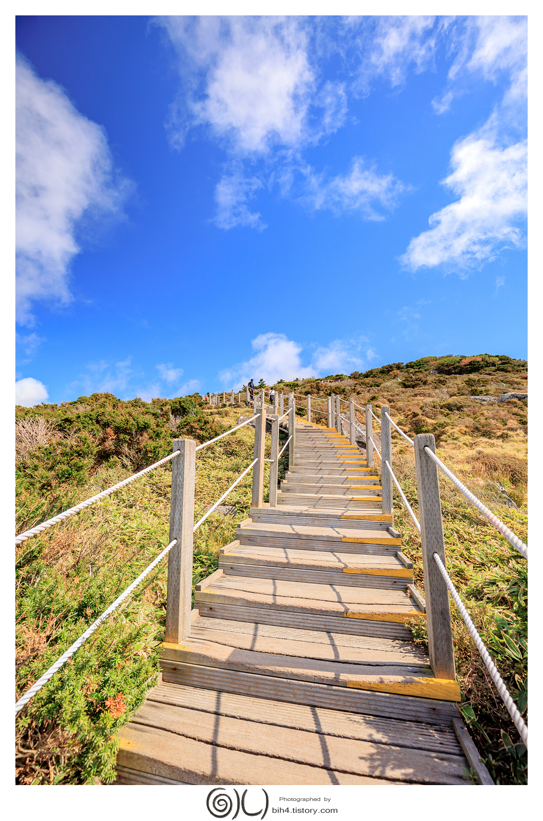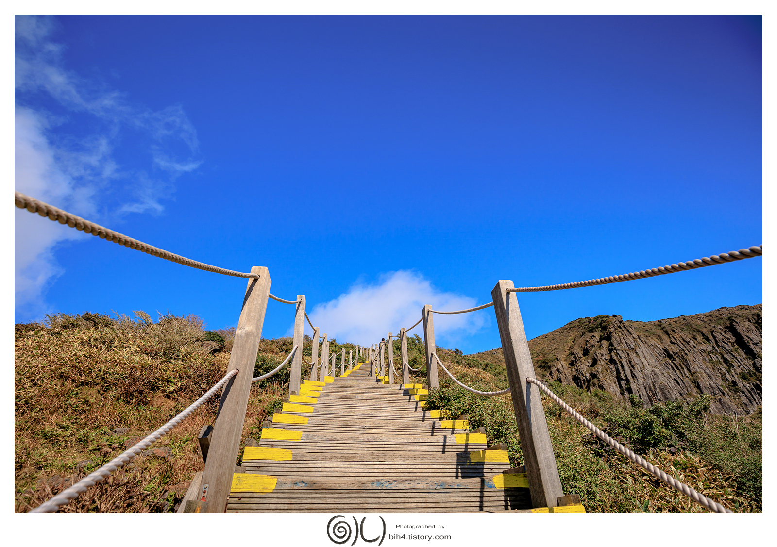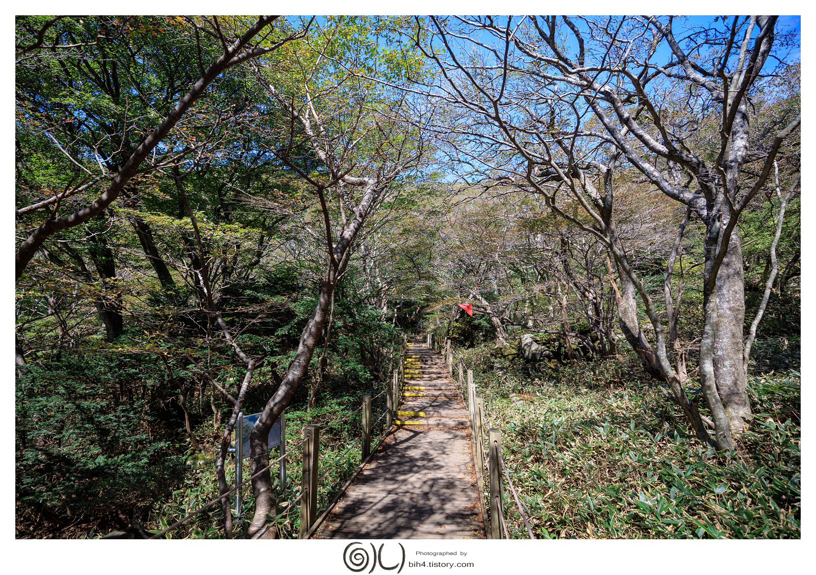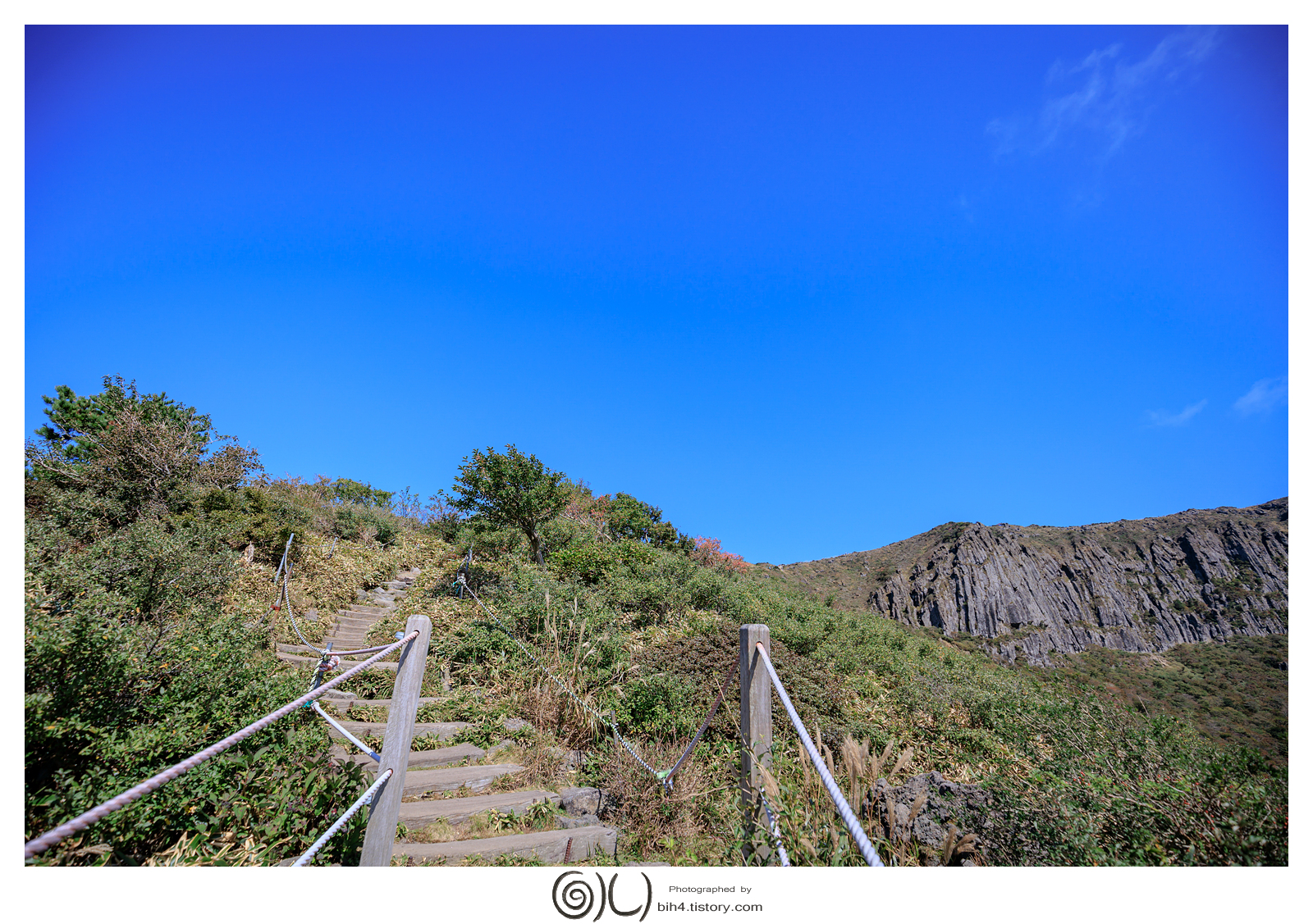 우거진 나무 사이로 등산하다 보면 어느순간 계단들과 한라산의 모습을 보여주웠다